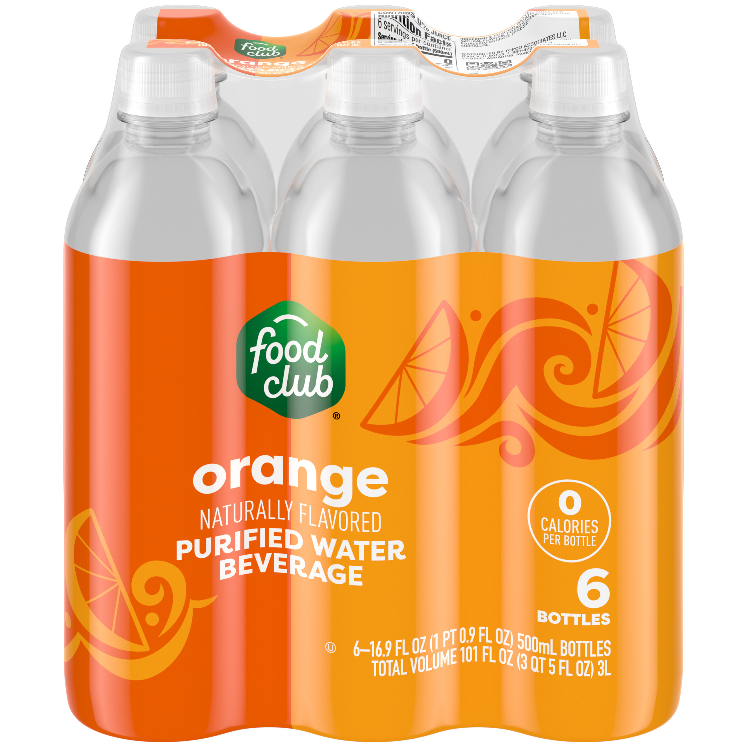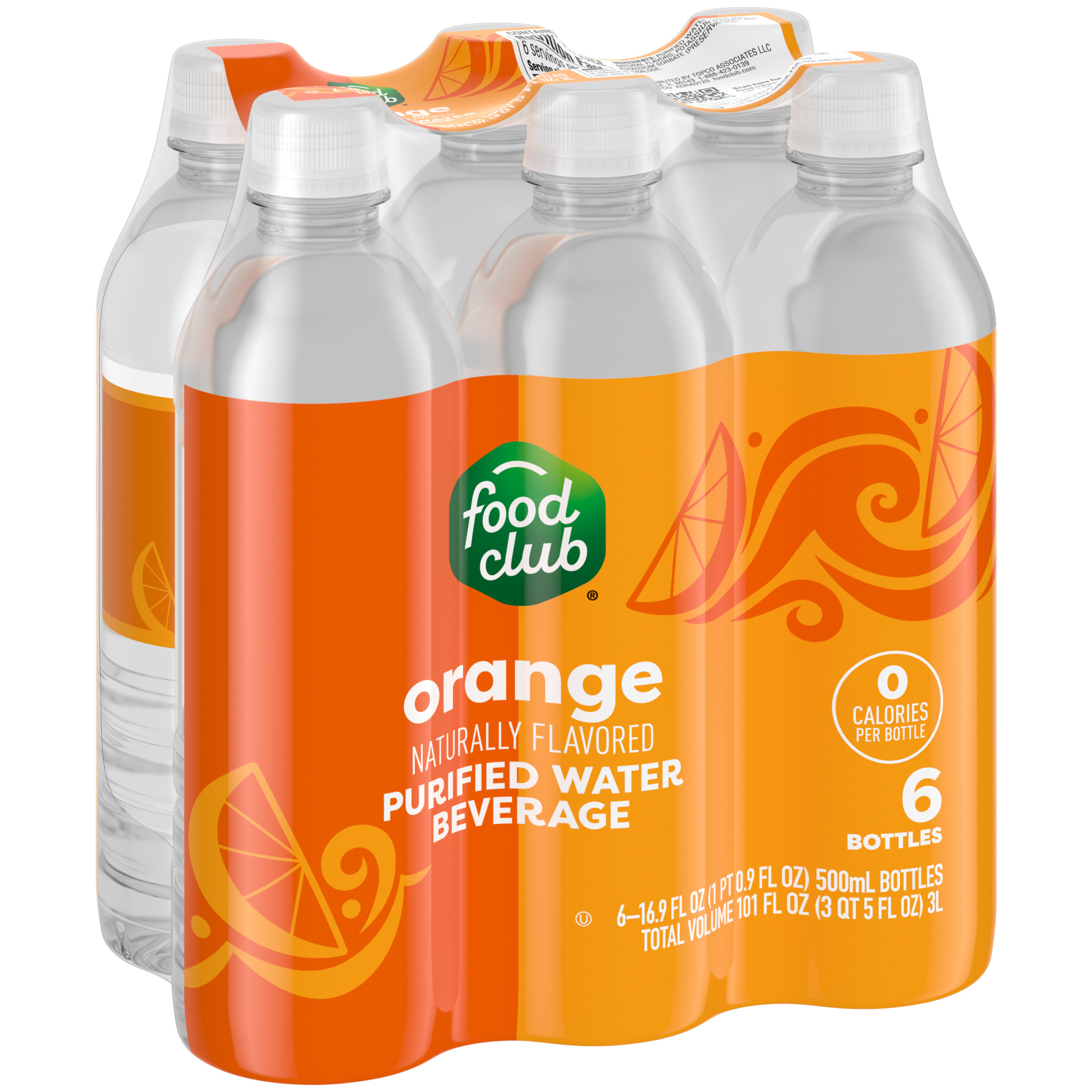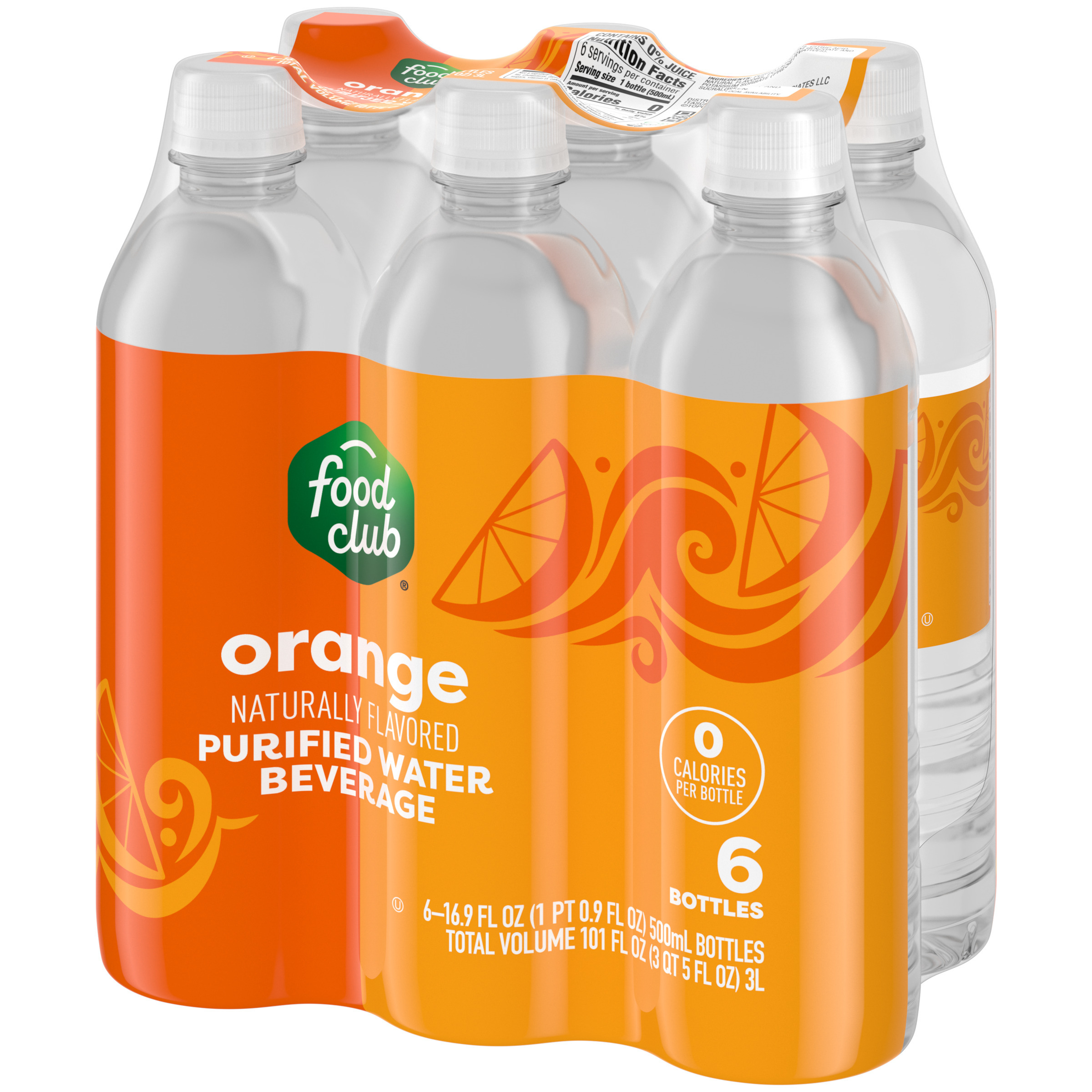 Food Club Orange Purified Water Beverage 6 - 16.9 fl oz Bottles