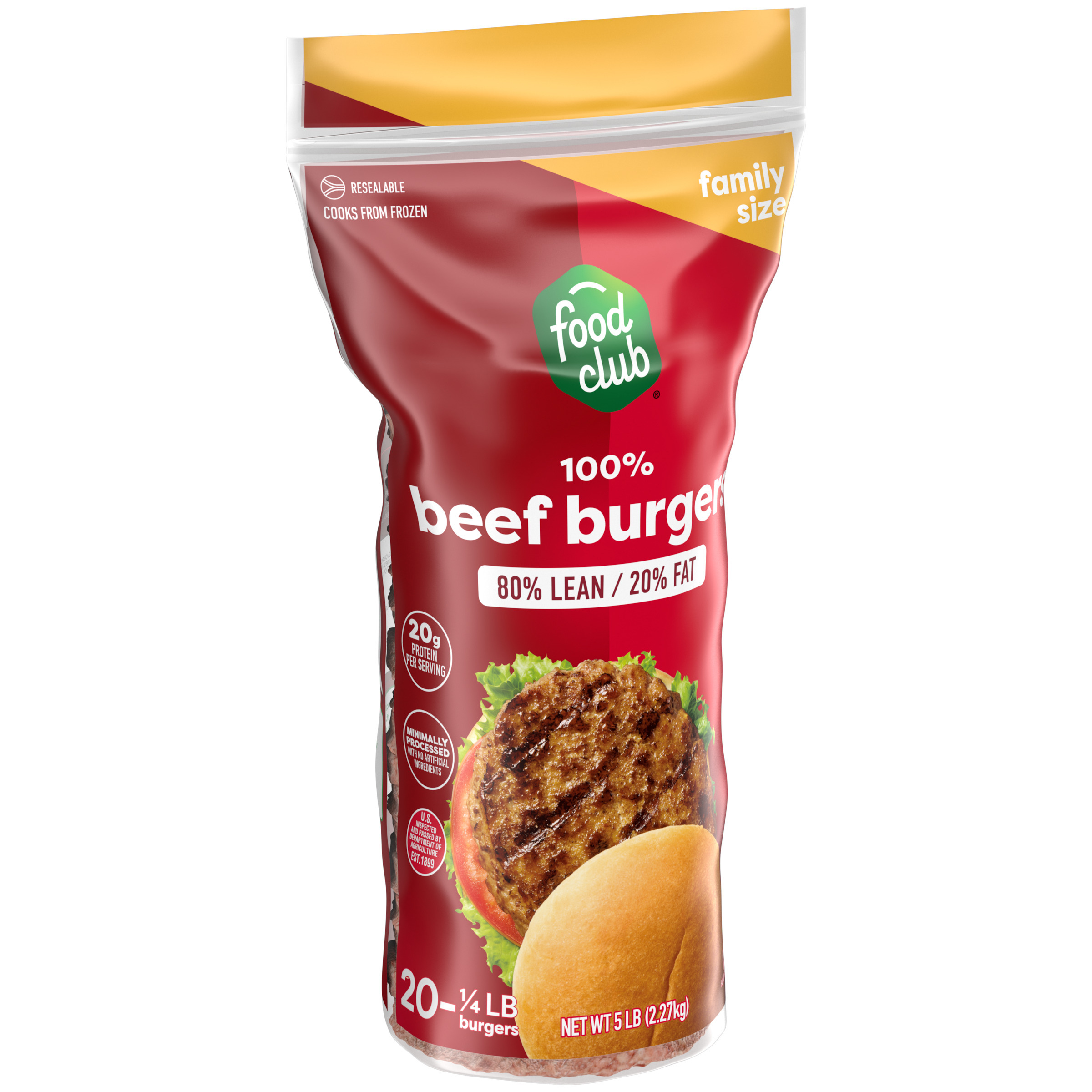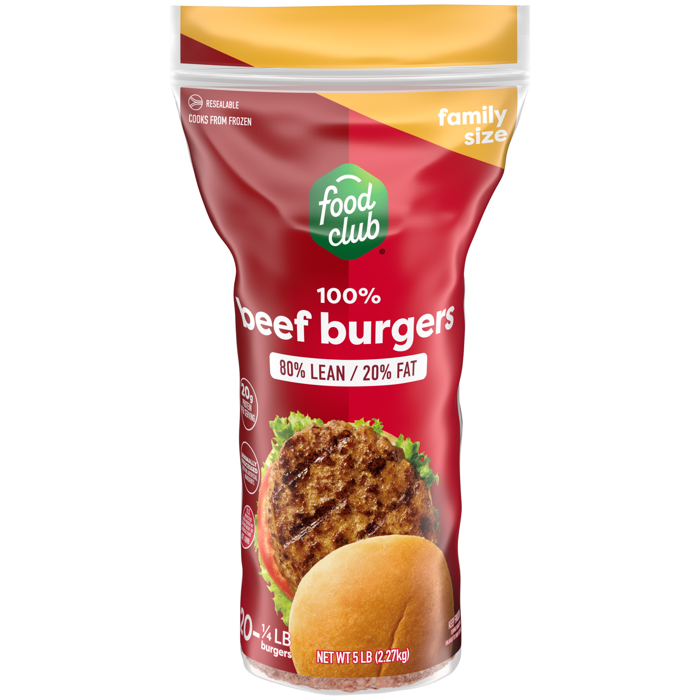 Food Club 100% 80%/20% Beef Burgers Family Size 20 - 0.25 lb Each