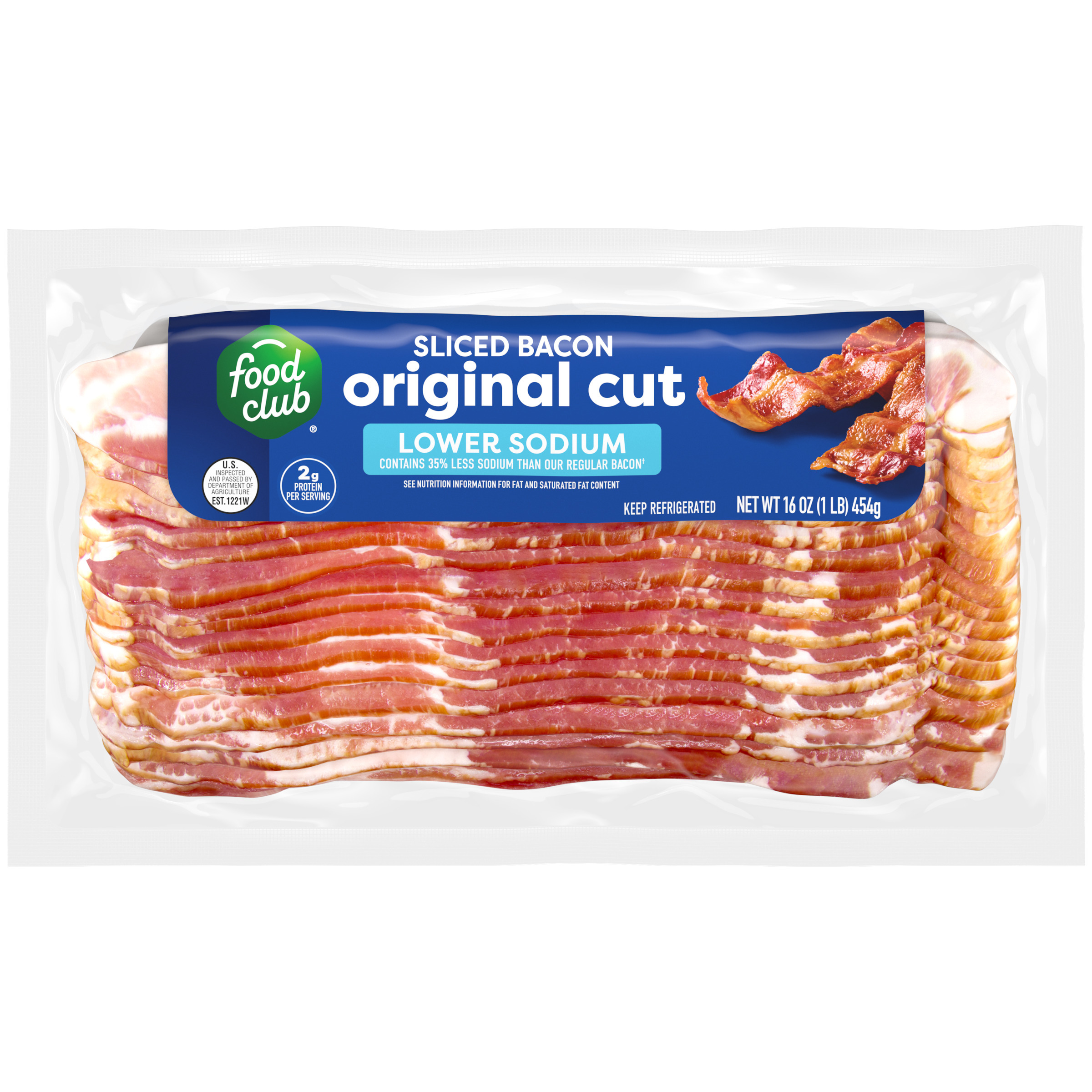 Lower sodium – Contains 35% less sodium than regular Food Club® bacon† (†This product contains 100mg of sodium per serving versus 160mg per serving in regular Food Club® sliced bacon.)