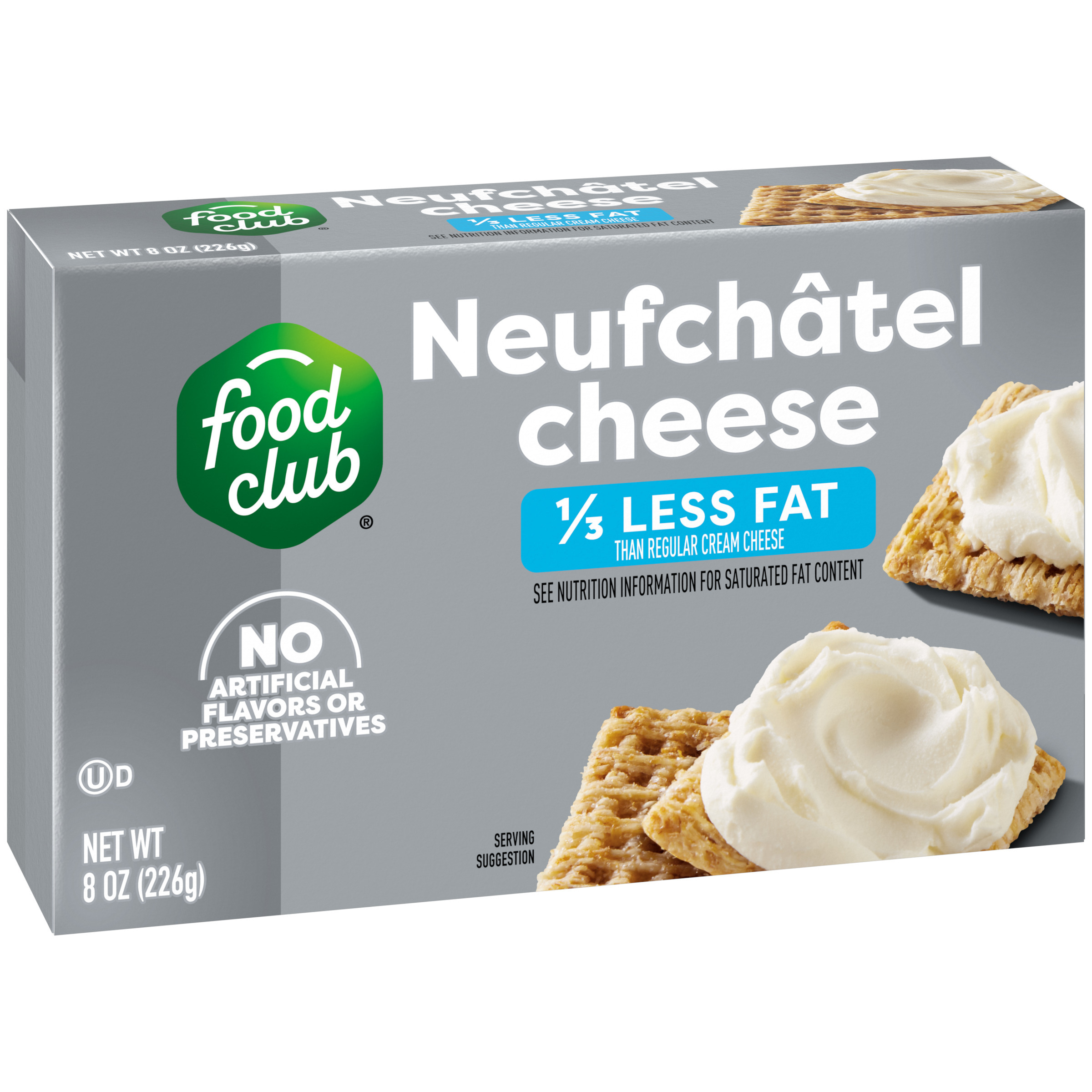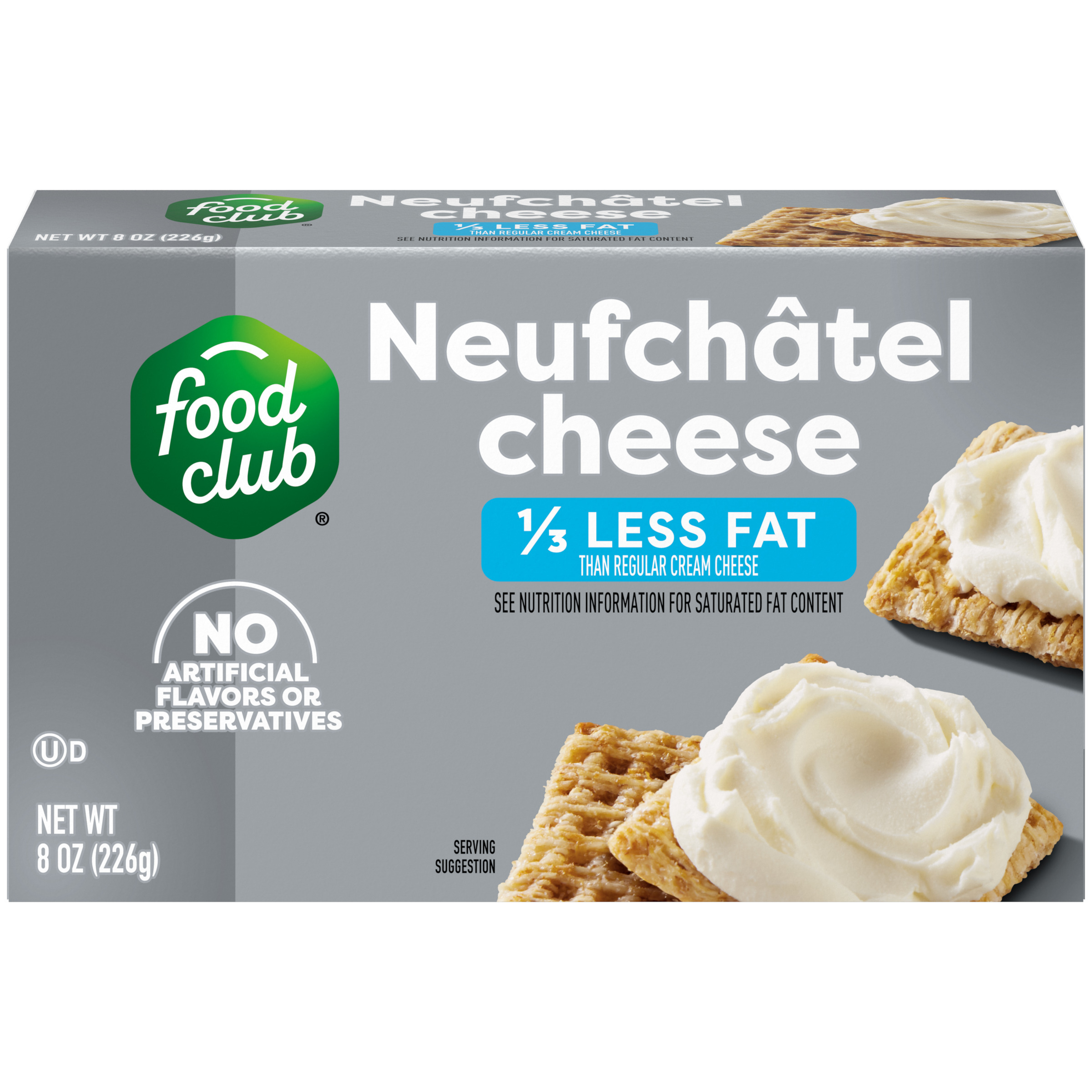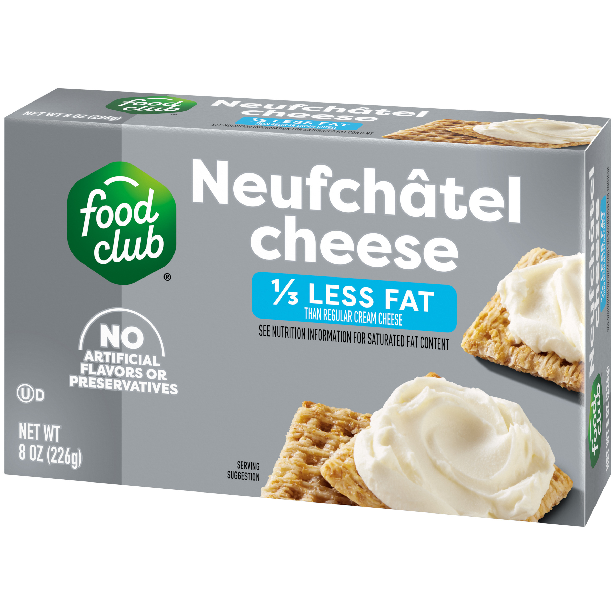 1/3 less fat than regular cream cheese. See nutrition information for saturated fat content. Food Club Neufchâtel Cheese: 6 g fat per serving. Regular Cream Cheese: 9 g fat per serving.