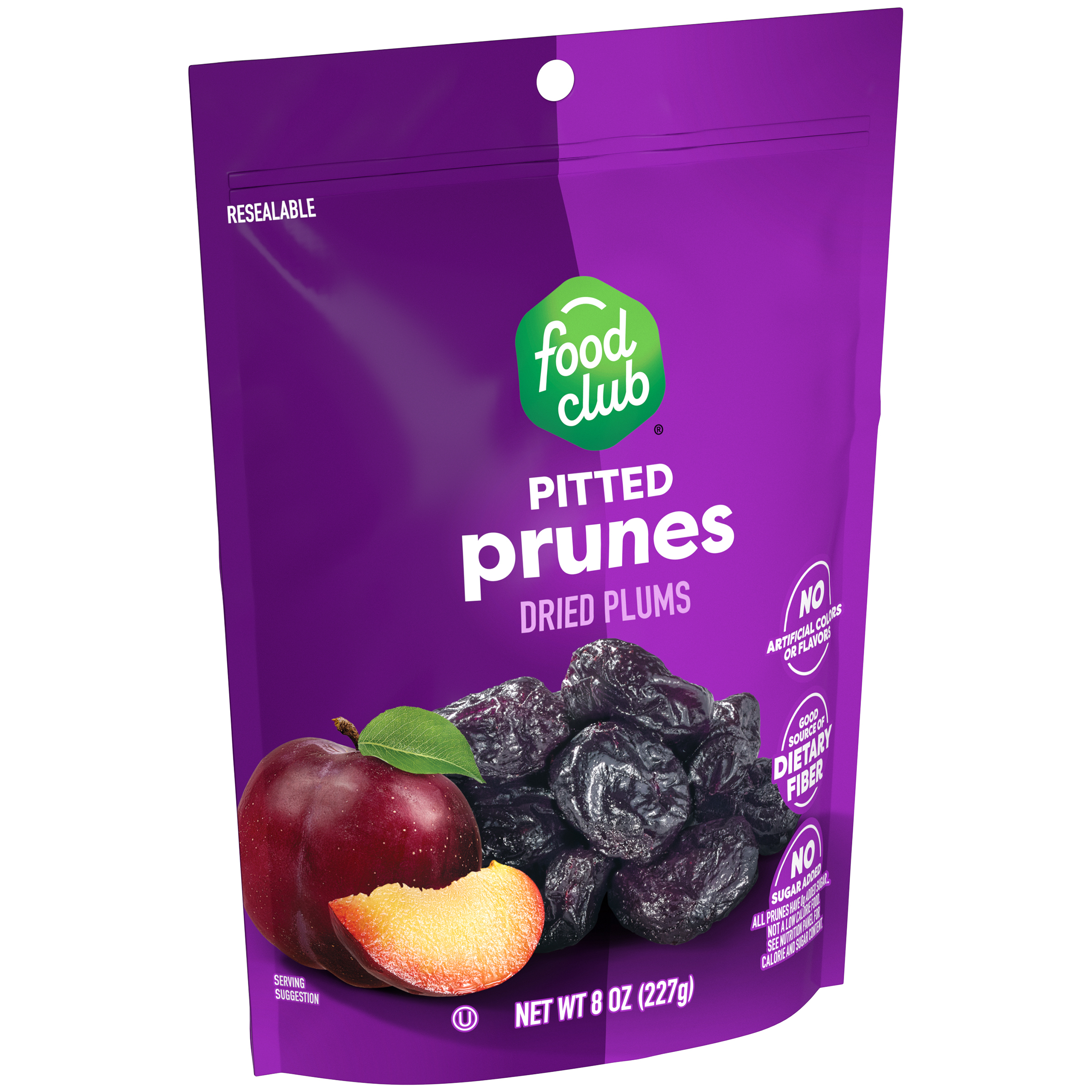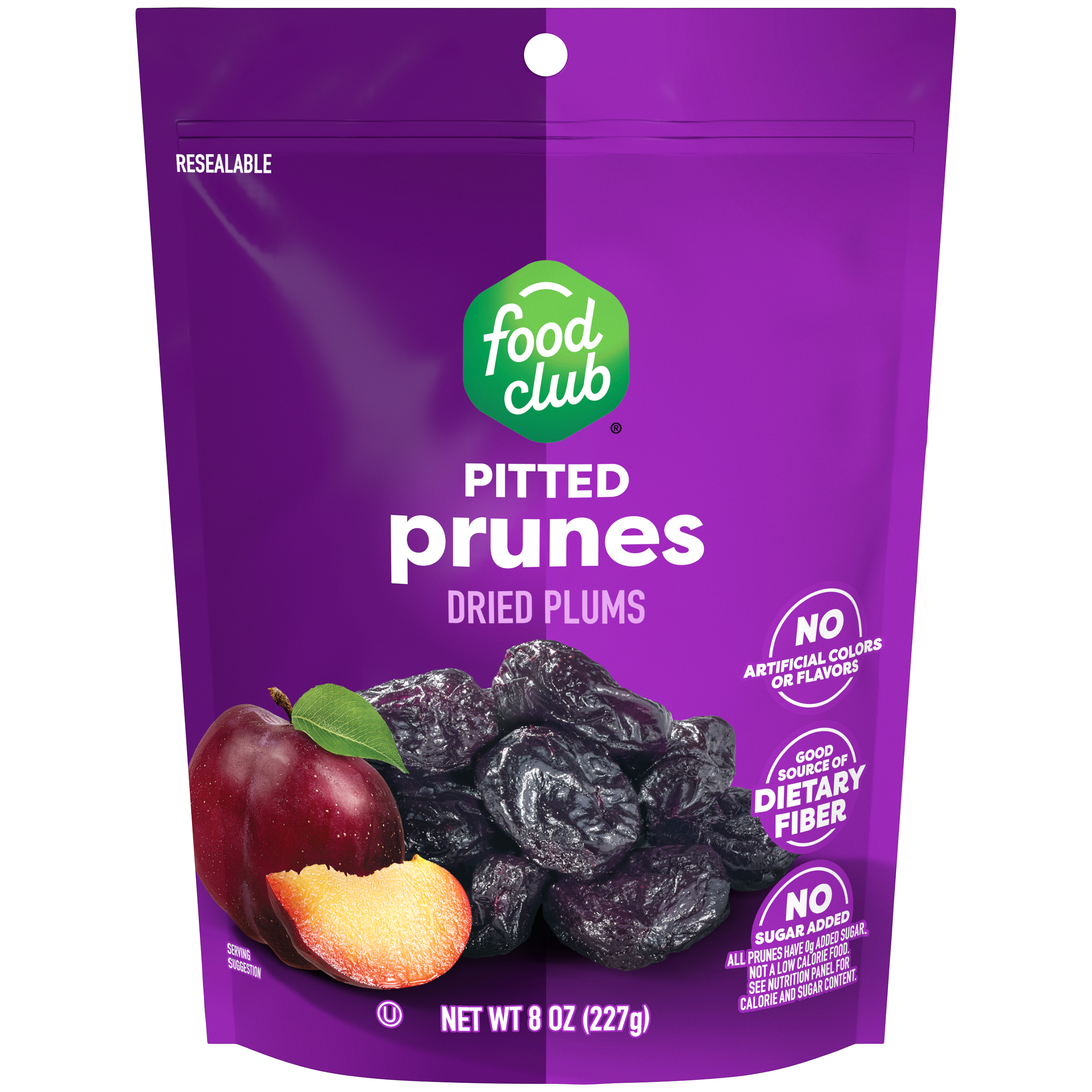 Good source of dietary fiber. No sugar added. All prunes have 0 g added sugar. Not a low calorie food. See nutrition panel for calorie and sugar content.